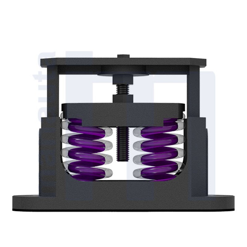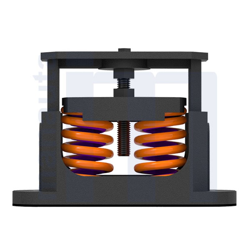 The two spring springs RSAD have the great deflection of the springs and the casing of cast iron that works as an exoskeleton and protects the spring from sudden movements of stoppages and starts of the equipment or of abnormal vibrations. Its anti-slip rubber base also performs the function of absorbing vibration and noise. To increase the load of these supports can be put a inner spring C99L lilac that gives 130 kg. more load with the same deflection. Comply with ASRHAE, book Applications, chap. 47, sec 47.44, type 4 “Restrained spring isolators”.
